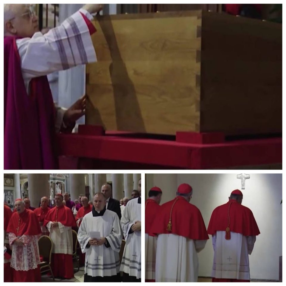 After the final prayer, the sigils of the Cardinal Camerlengo of the Holy Roman Church, Kevin Joseph Farrell, of the Prefecture of the Papal Household, of the Office of Liturgical Celebrations of the Roman Pontiff and of the Liberian Chapter were printed on the coffin.