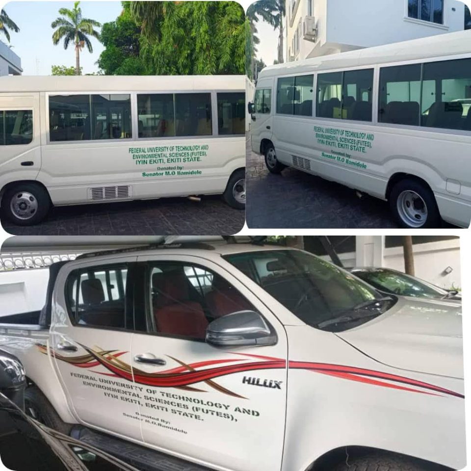 The Senate Leader, Senator Opeyemi Bamidele has donated two coaster buses, one Toyota hilux, two tricycles and two dispatch motorcycles to Federal University of Technology and Environmental Sciences (FUTES), Iyin Ekiti.