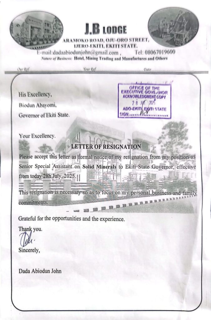 Dada Abiodun John, the senior personal assistant to Governor Biodun Oyebanji of Ekiti State on Solid Minerals has resigned from his position.