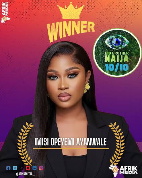 Imisi Ayanwale has emerged the winner of Big Brother Naija Season 10, taking home the coveted grand prize of N150,000,000 and the title of Africa’s most talked-about reality star.